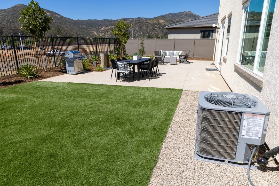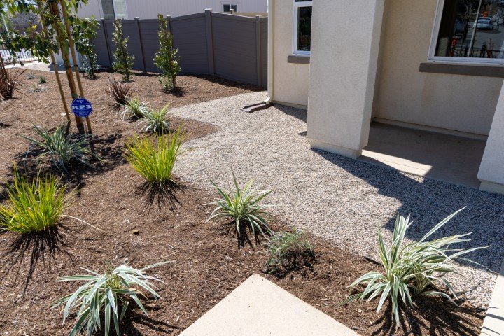 Replace combustible groundcover (e.g., wood/rubber mulch, pine needles, and exposed weed cloth) with noncombustible hardscapes such as gravel, pavers, river rocks, decomposed granite (DG), steppingstones, or concrete.