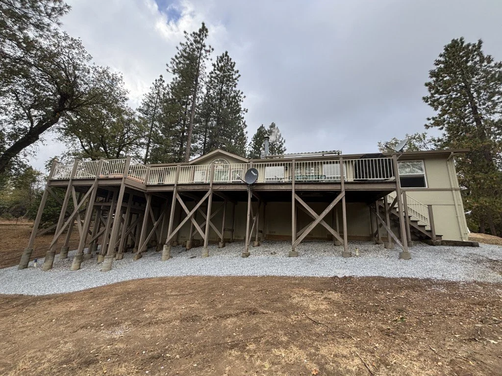 Clear all vegetation and combustible groundcover, including grass, weeds, plants, exposed weed cloth, artificial turf, and wood mulch within the 0–5 Foot Noncombustible Zone beneath and around the deck and stairs. Replace with noncombustible hardscape such as bare soil, gravel, pavers, river rock, decomposed granite (DG), or concrete.