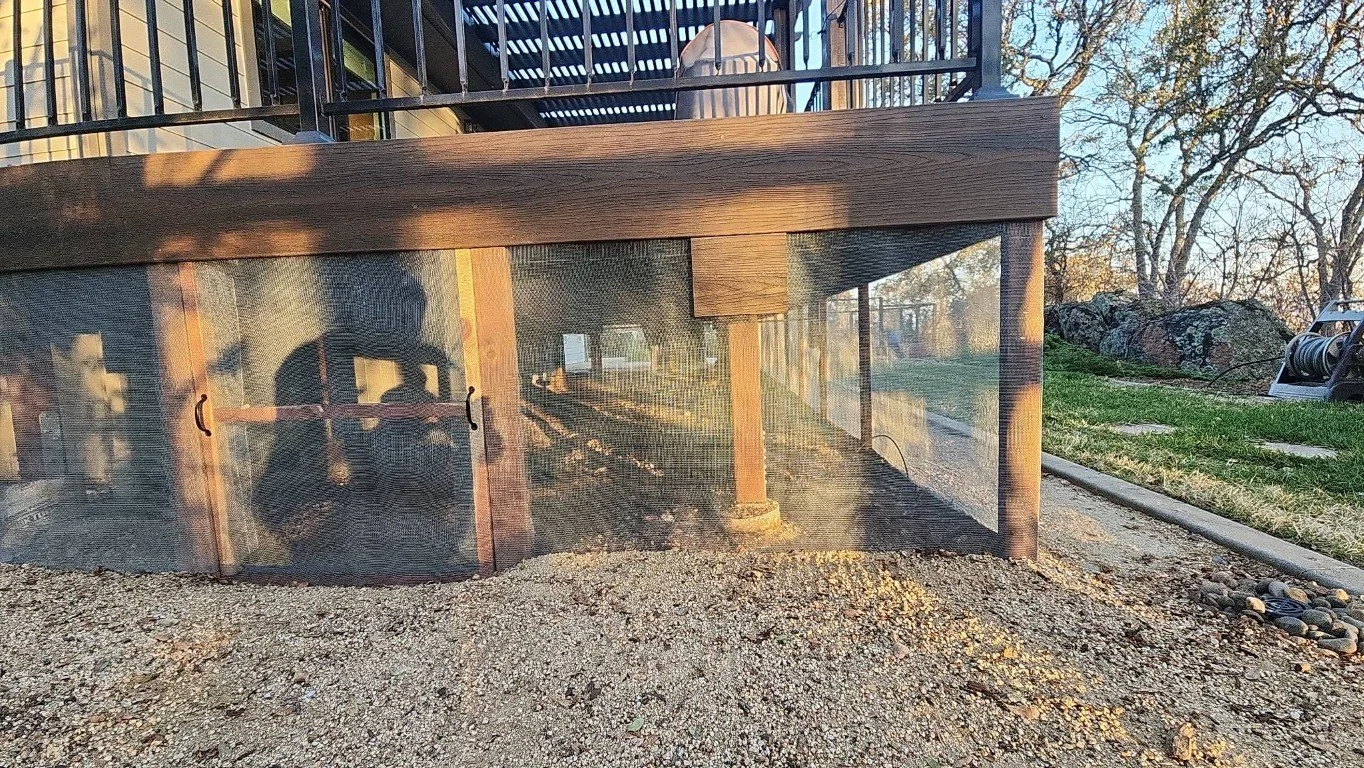 Decks 4 Feet or Less above ground level: Enclose the underside to prevent ember and debris accumulation using 1/8-inch or finer metal wire mesh from the outer edge of the walking surface to the ground.